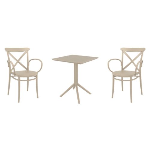 Transform your small outdoor area into a stylish space with Cross XL arm chairs and Sky 24" square folding table 3 piece bistro set in taupe. Made from durable polypropylene resin, this bistro set is perfect for balconies, terraces, decks, patios, cafes and restaurants. Cross XL arm chairs feature a sleek and contemporary design that adds a touch of sophistication to any space. Sky 24" square folding table provides plenty of room for two people to sit and enjoy a meal or drink together.