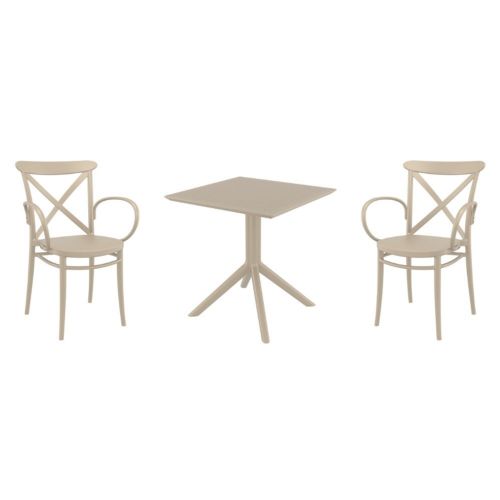 Introducing the Cross XL arm chairs and Sky 27" square table 3 piece dining set in Taupe - the perfect addition to any small outdoor living area! Crafted from high-quality polypropylene resin, this set is durable and weather-resistant, ensuring it will last you for years to come. Cross XL arm chairs feature a sleek and modern design, with a comfortable seat and backrest. Sky 27" square table providing ample space for two people to enjoy a meal or drink together.