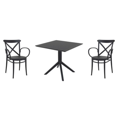 Introducing the Cross XL arm chairs and Sky 31" square table 3 piece dining set in Black - the perfect addition to any small outdoor living area! Crafted from high-quality polypropylene resin, this set is durable and weather-resistant, ensuring it will last you for years to come. Cross XL arm chairs feature a sleek and modern design, with a comfortable seat and backrest. Sky 31" square table providing ample space for two people to enjoy a meal or drink together.