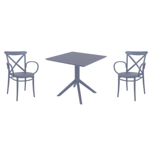 Introducing the Cross XL arm chairs and Sky 31" square table 3 piece dining set in Dark Gray - the perfect addition to any small outdoor living area! Crafted from high-quality polypropylene resin, this set is durable and weather-resistant, ensuring it will last you for years to come. Cross XL arm chairs feature a sleek and modern design, with a comfortable seat and backrest. Sky 31" square table providing ample space for two people to enjoy a meal or drink together.