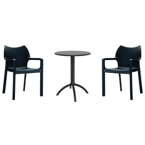 Transform your small outdoor area into a stylish space with Diva arm chairs and Octopus 24" round table 3 piece bistro set in black. Made from durable polypropylene resin, this bistro set is perfect for balconies, terraces, decks, patios, cafes and restaurants. Diva arm chairs feature a sleek and contemporary design that adds a touch of sophistication to any space. Octopus 24" round table provides plenty of room for two people to sit and enjoy a meal or drink together.