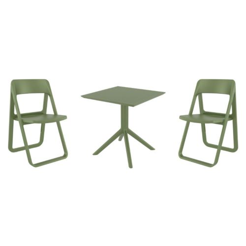 Introducing the Dream folding chairs and Sky 27" square table 3 piece dining set in Olive Green - the perfect addition to any small outdoor living area! Crafted from high-quality polypropylene resin, this set is durable and weather-resistant, ensuring it will last you for years to come. Dream folding chairs feature a sleek and modern design, with a comfortable seat and backrest. Sky 27" square table providing ample space for two people to enjoy a meal or drink together.