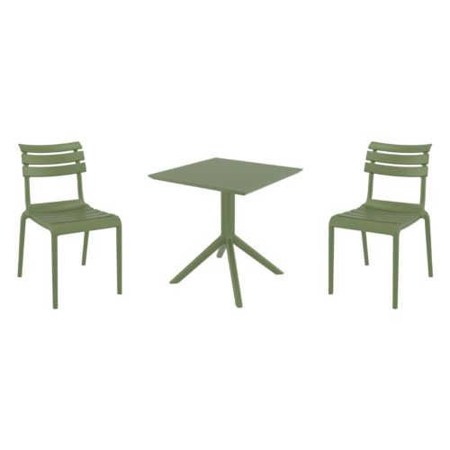 Introducing the Helen chairs and Sky 27" square table 3 piece dining set in Olive Green - the perfect addition to any small outdoor living area! Crafted from high-quality polypropylene resin, this set is durable and weather-resistant, ensuring it will last you for years to come. Helen chairs feature a sleek and modern design, with a comfortable seat and backrest. Sky 27" square table providing ample space for two people to enjoy a meal or drink together.