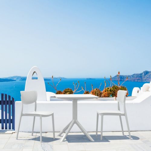 Lucy outdoor bistro set with two dining chairs and one square table. Contemporary design. Made from commercial grade resin with gas injection molded legs. Extremely durable for outdoor temperatures. Easy cleaning. Perfect for heavy use indoor outdoor areas.