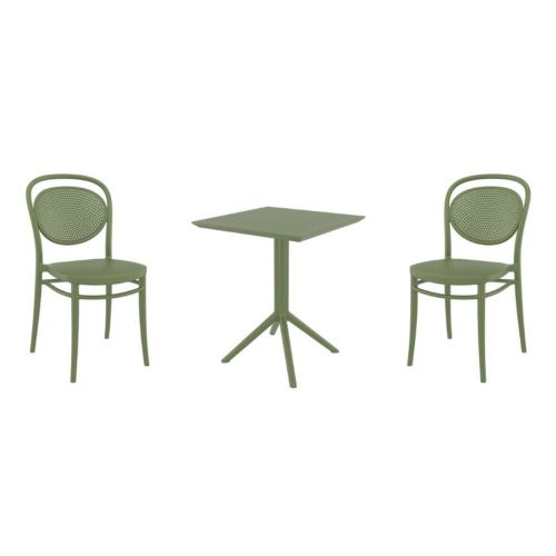 Transform your small outdoor area into a stylish space with Marcel chairs and Sky 24" square folding table 3 piece bistro set in olive green. Made from durable polypropylene resin, this bistro set is perfect for balconies, terraces, decks, patios, cafes and restaurants. Marcel chairs feature a sleek and contemporary design that adds a touch of sophistication to any space. Sky 24" square folding table provides plenty of room for two people to sit and enjoy a meal or drink together.