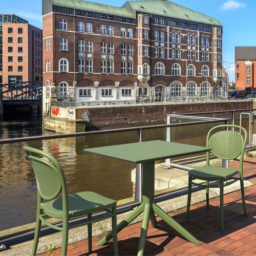 Introducing the Marcel chairs and Sky 27" square table 3 piece dining set in Olive Green - the perfect addition to any small outdoor living area! Crafted from high-quality polypropylene resin, this set is durable and weather-resistant, ensuring it will last you for years to come. Marcel chairs feature a sleek and modern design, with a comfortable seat and backrest. Sky 27" square table providing ample space for two people to enjoy a meal or drink together.