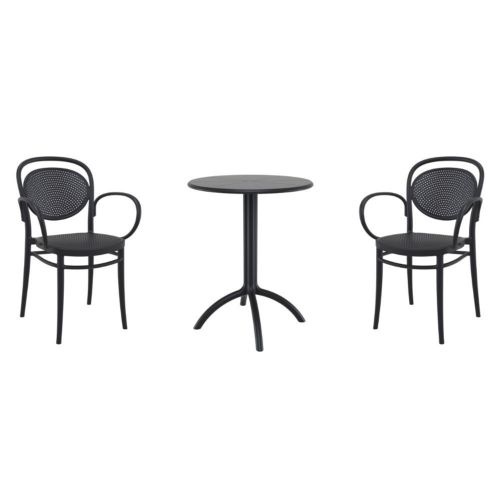 Transform your small outdoor area into a stylish space with Marcel XL arm chairs and Octopus 24" round table 3 piece bistro set in black. Made from durable polypropylene resin, this bistro set is perfect for balconies, terraces, decks, patios, cafes and restaurants. Marcel XL arm chairs feature a sleek and contemporary design that adds a touch of sophistication to any space. Octopus 24" round table provides plenty of room for two people to sit and enjoy a meal or drink together.