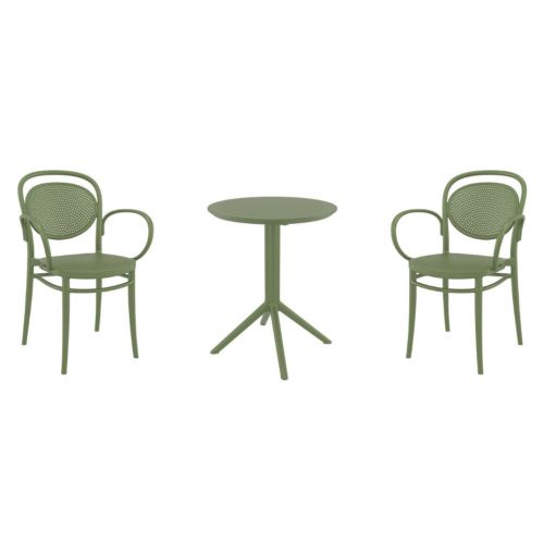 Transform your small outdoor area into a stylish space with Marcel XL arm chairs and Sky 24" round folding table 3 piece bistro set in olive green. Made from durable polypropylene resin, this bistro set is perfect for balconies, terraces, decks, patios, cafes and restaurants. Marcel XL arm chairs feature a sleek and contemporary design that adds a touch of sophistication to any space. Sky 24" round folding table provides plenty of room for two people to sit and enjoy a meal or drink together.