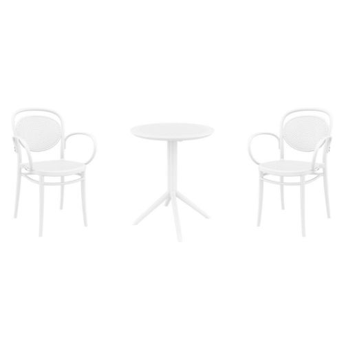 Transform your small outdoor area into a stylish space with Marcel XL arm chairs and Sky 24" round folding table 3 piece bistro set in white. Made from durable polypropylene resin, this bistro set is perfect for balconies, terraces, decks, patios, cafes and restaurants. Marcel XL arm chairs feature a sleek and contemporary design that adds a touch of sophistication to any space. Sky 24" round folding table provides plenty of room for two people to sit and enjoy a meal or drink together.