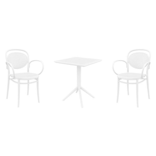 Transform your small outdoor area into a stylish space with Marcel XL arm chairs and Sky 24" square folding table 3 piece bistro set in white. Made from durable polypropylene resin, this bistro set is perfect for balconies, terraces, decks, patios, cafes and restaurants. Marcel XL arm chairs feature a sleek and contemporary design that adds a touch of sophistication to any space. Sky 24" square folding table provides plenty of room for two people to sit and enjoy a meal or drink together.