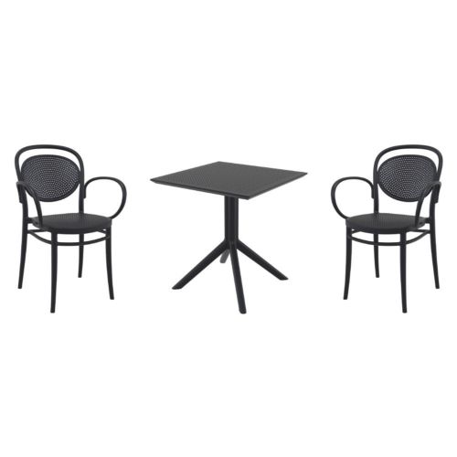 Introducing the Marcel XL arm chairs and Sky 27" square table 3 piece dining set in Black - the perfect addition to any small outdoor living area! Crafted from high-quality polypropylene resin, this set is durable and weather-resistant, ensuring it will last you for years to come. Marcel XL arm chairs feature a sleek and modern design, with a comfortable seat and backrest. Sky 27" square table providing ample space for two people to enjoy a meal or drink together.