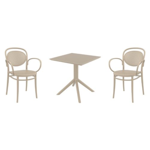 Introducing the Marcel XL arm chairs and Sky 27" square table 3 piece dining set in Taupe - the perfect addition to any small outdoor living area! Crafted from high-quality polypropylene resin, this set is durable and weather-resistant, ensuring it will last you for years to come. Marcel XL arm chairs feature a sleek and modern design, with a comfortable seat and backrest. Sky 27" square table providing ample space for two people to enjoy a meal or drink together.