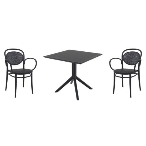 Introducing the Marcel XL arm chairs and Sky 31" square table 3 piece dining set in Black - the perfect addition to any small outdoor living area! Crafted from high-quality polypropylene resin, this set is durable and weather-resistant, ensuring it will last you for years to come. Marcel XL arm chairs feature a sleek and modern design, with a comfortable seat and backrest. Sky 31" square table providing ample space for two people to enjoy a meal or drink together.