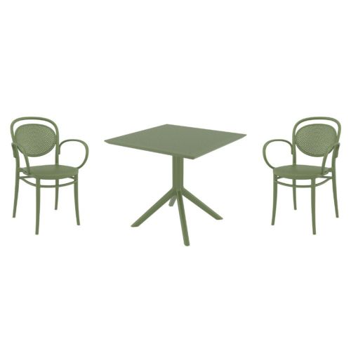 Introducing the Marcel XL arm chairs and Sky 31" square table 3 piece dining set in Olive Green - the perfect addition to any small outdoor living area! Crafted from high-quality polypropylene resin, this set is durable and weather-resistant, ensuring it will last you for years to come. Marcel XL arm chairs feature a sleek and modern design, with a comfortable seat and backrest. Sky 31" square table providing ample space for two people to enjoy a meal or drink together.