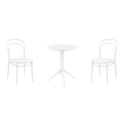 Transform your small outdoor area into a stylish space with Marie chairs and Sky 24" round folding table 3 piece bistro set in white. Made from durable polypropylene resin, this bistro set is perfect for balconies, terraces, decks, patios, cafes and restaurants. Marie chairs feature a sleek and contemporary design that adds a touch of sophistication to any space. Sky 24" round folding table provides plenty of room for two people to sit and enjoy a meal or drink together.