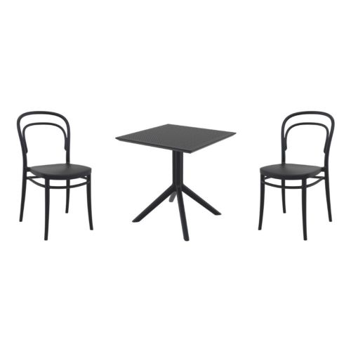 Introducing the Marie chairs and Sky 27" square table 3 piece dining set in Black - the perfect addition to any small outdoor living area! Crafted from high-quality polypropylene resin, this set is durable and weather-resistant, ensuring it will last you for years to come. Marie chairs feature a sleek and modern design, with a comfortable seat and backrest. Sky 27" square table providing ample space for two people to enjoy a meal or drink together.