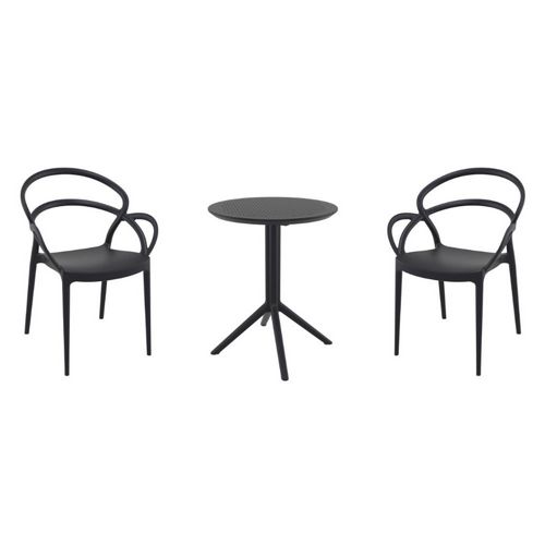 Transform your small outdoor area into a stylish space with Mila arm chairs and Sky 24" round folding table 3 piece bistro set in black. Made from durable polypropylene resin, this bistro set is perfect for balconies, terraces, decks, patios, cafes and restaurants. Mila arm chairs feature a sleek and contemporary design that adds a touch of sophistication to any space. Sky 24" round folding table provides plenty of room for two people to sit and enjoy a meal or drink together.