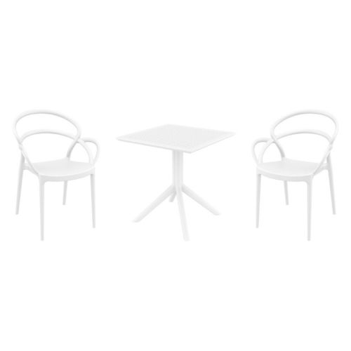 Introducing the Mila arm chairs and Sky 27" square table 3 piece dining set in White - the perfect addition to any small outdoor living area! Crafted from high-quality polypropylene resin, this set is durable and weather-resistant, ensuring it will last you for years to come. Mila arm chairs feature a sleek and modern design, with a comfortable seat and backrest. Sky 27" square table providing ample space for two people to enjoy a meal or drink together.