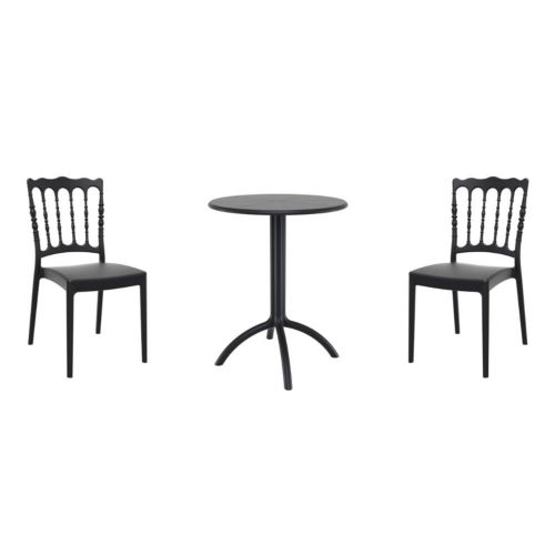 Transform your small outdoor area into a stylish space with Napoleon chairs and Octopus 24" round table 3 piece bistro set in black. Made from durable polypropylene resin, this bistro set is perfect for balconies, terraces, decks, patios, cafes and restaurants. Napoleon chairs feature a sleek and contemporary design that adds a touch of sophistication to any space. Octopus 24" round table provides plenty of room for two people to sit and enjoy a meal or drink together.