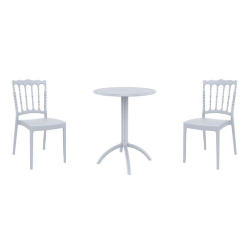 Transform your small outdoor area into a stylish space with Napoleon chairs and Octopus 24" round table 3 piece bistro set in silver gray. Made from durable polypropylene resin, this bistro set is perfect for balconies, terraces, decks, patios, cafes and restaurants. Napoleon chairs feature a sleek and contemporary design that adds a touch of sophistication to any space. Octopus 24" round table provides plenty of room for two people to sit and enjoy a meal or drink together.