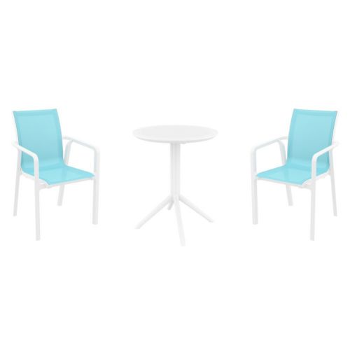 Transform your small outdoor area into a stylish space with Pacific sling arm chairs and Sky 24" round folding table 3 piece bistro set in white and turquoise. Made from durable polypropylene resin, this bistro set is perfect for balconies, terraces, decks, patios, cafes and restaurants. Pacific sling arm chairs feature a sleek and contemporary design that adds a touch of sophistication to any space. Sky 24" round folding table provides plenty of room for two people to sit and enjoy a meal or drink together.