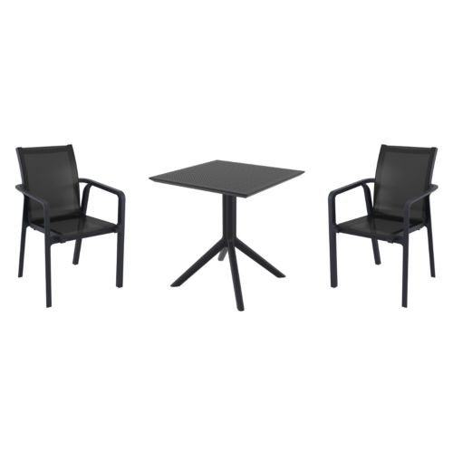 Introducing the Pacific sling arm chairs and Sky 27" square table 3 piece dining set in Black - the perfect addition to any small outdoor living area! Crafted from high-quality polypropylene resin, this set is durable and weather-resistant, ensuring it will last you for years to come. Pacific sling arm chairs feature a sleek and modern design, with a comfortable seat and backrest. Sky 27" square table providing ample space for two people to enjoy a meal or drink together.