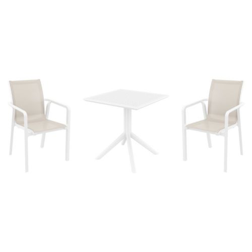 Introducing the Pacific sling arm chairs and Sky 27" square table 3 piece dining set in White and Taupe - the perfect addition to any small outdoor living area! Crafted from high-quality polypropylene resin, this set is durable and weather-resistant, ensuring it will last you for years to come. Pacific sling arm chairs feature a sleek and modern design, with a comfortable seat and backrest. Sky 27" square table providing ample space for two people to enjoy a meal or drink together.