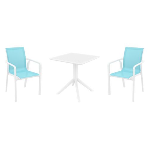 Introducing the Pacific sling arm chairs and Sky 27" square table 3 piece dining set in White and Turquoise - the perfect addition to any small outdoor living area! Crafted from high-quality polypropylene resin, this set is durable and weather-resistant, ensuring it will last you for years to come. Pacific sling arm chairs feature a sleek and modern design, with a comfortable seat and backrest. Sky 27" square table providing ample space for two people to enjoy a meal or drink together.