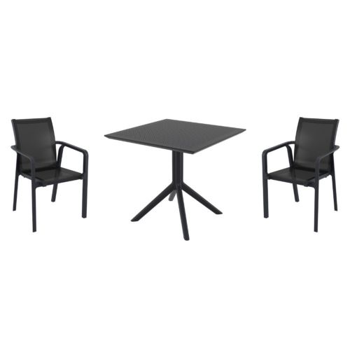 Introducing the Pacific sling arm chairs and Sky 31" square table 3 piece dining set in Black - the perfect addition to any small outdoor living area! Crafted from high-quality polypropylene resin, this set is durable and weather-resistant, ensuring it will last you for years to come. Pacific sling arm chairs feature a sleek and modern design, with a comfortable seat and backrest. Sky 31" square table providing ample space for two people to enjoy a meal or drink together.