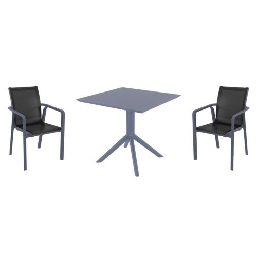 Introducing the Pacific sling arm chairs and Sky 31" square table 3 piece dining set in Dark Gray and Black - the perfect addition to any small outdoor living area! Crafted from high-quality polypropylene resin, this set is durable and weather-resistant, ensuring it will last you for years to come. Pacific sling arm chairs feature a sleek and modern design, with a comfortable seat and backrest. Sky 31" square table providing ample space for two people to enjoy a meal or drink together.