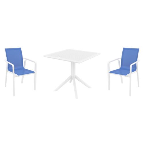 Introducing the Pacific sling arm chairs and Sky 31" square table 3 piece dining set in White and Blue - the perfect addition to any small outdoor living area! Crafted from high-quality polypropylene resin, this set is durable and weather-resistant, ensuring it will last you for years to come. Pacific sling arm chairs feature a sleek and modern design, with a comfortable seat and backrest. Sky 31" square table providing ample space for two people to enjoy a meal or drink together.