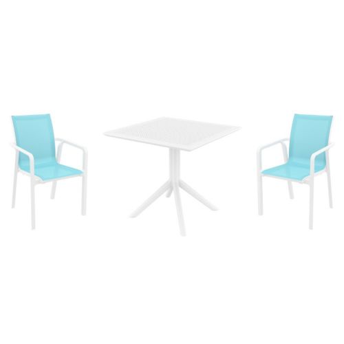 Introducing the Pacific sling arm chairs and Sky 31" square table 3 piece dining set in White and Turquoise - the perfect addition to any small outdoor living area! Crafted from high-quality polypropylene resin, this set is durable and weather-resistant, ensuring it will last you for years to come. Pacific sling arm chairs feature a sleek and modern design, with a comfortable seat and backrest. Sky 31" square table providing ample space for two people to enjoy a meal or drink together.