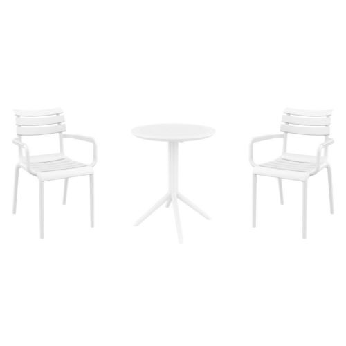 Transform your small outdoor area into a stylish space with Paris arm chairs and Sky 24" round folding table 3 piece bistro set in white. Made from durable polypropylene resin, this bistro set is perfect for balconies, terraces, decks, patios, cafes and restaurants. Paris arm chairs feature a sleek and contemporary design that adds a touch of sophistication to any space. Sky 24" round folding table provides plenty of room for two people to sit and enjoy a meal or drink together.