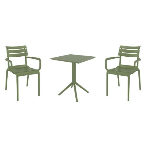 Transform your small outdoor area into a stylish space with Paris arm chairs and Sky 24" square folding table 3 piece bistro set in olive green. Made from durable polypropylene resin, this bistro set is perfect for balconies, terraces, decks, patios, cafes and restaurants. Paris arm chairs feature a sleek and contemporary design that adds a touch of sophistication to any space. Sky 24" square folding table provides plenty of room for two people to sit and enjoy a meal or drink together.