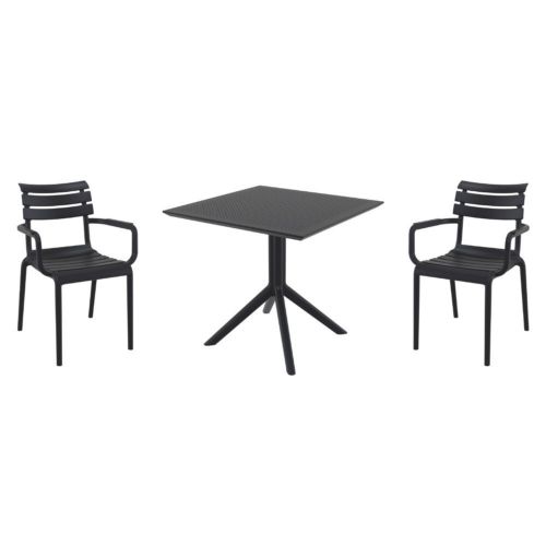 Introducing the Paris arm chairs and Sky 31" square table 3 piece dining set in Black - the perfect addition to any small outdoor living area! Crafted from high-quality polypropylene resin, this set is durable and weather-resistant, ensuring it will last you for years to come. Paris arm chairs feature a sleek and modern design, with a comfortable seat and backrest. Sky 31" square table providing ample space for two people to enjoy a meal or drink together.