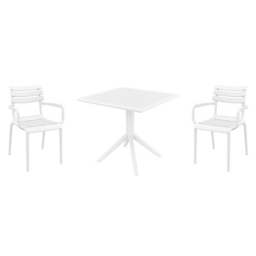 Introducing the Paris arm chairs and Sky 31" square table 3 piece dining set in White - the perfect addition to any small outdoor living area! Crafted from high-quality polypropylene resin, this set is durable and weather-resistant, ensuring it will last you for years to come. Paris arm chairs feature a sleek and modern design, with a comfortable seat and backrest. Sky 31" square table providing ample space for two people to enjoy a meal or drink together.