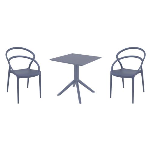 Introducing the Pia chairs and Sky 27" square table 3 piece dining set in Dark Gray - the perfect addition to any small outdoor living area! Crafted from high-quality polypropylene resin, this set is durable and weather-resistant, ensuring it will last you for years to come. Pia chairs feature a sleek and modern design, with a comfortable seat and backrest. Sky 27" square table providing ample space for two people to enjoy a meal or drink together.