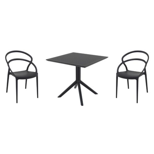Introducing the Pia chairs and Sky 31" square table 3 piece dining set in Black - the perfect addition to any small outdoor living area! Crafted from high-quality polypropylene resin, this set is durable and weather-resistant, ensuring it will last you for years to come. Pia chairs feature a sleek and modern design, with a comfortable seat and backrest. Sky 31" square table providing ample space for two people to enjoy a meal or drink together.