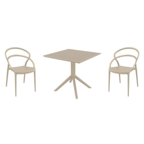 Introducing the Pia chairs and Sky 31" square table 3 piece dining set in Taupe - the perfect addition to any small outdoor living area! Crafted from high-quality polypropylene resin, this set is durable and weather-resistant, ensuring it will last you for years to come. Pia chairs feature a sleek and modern design, with a comfortable seat and backrest. Sky 31" square table providing ample space for two people to enjoy a meal or drink together.