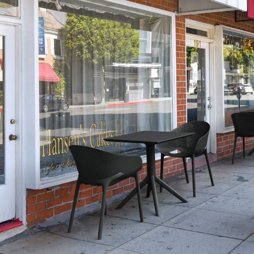 Introducing the Sky Pro arm chairs and Sky 27" square table 3 piece dining set in Black - the perfect addition to any small outdoor living area! Crafted from high-quality polypropylene resin, this set is durable and weather-resistant, ensuring it will last you for years to come. Sky Pro arm chairs feature a sleek and modern design, with a comfortable seat and backrest. Sky 27" square table providing ample space for two people to enjoy a meal or drink together.