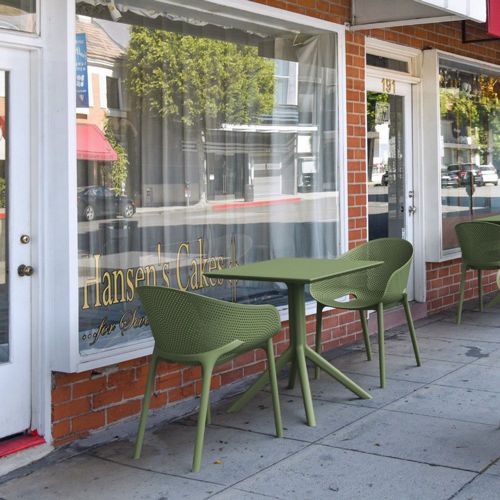 Introducing the Sky Pro arm chairs and Sky 27" square table 3 piece dining set in Olive Green - the perfect addition to any small outdoor living area! Crafted from high-quality polypropylene resin, this set is durable and weather-resistant, ensuring it will last you for years to come. Sky Pro arm chairs feature a sleek and modern design, with a comfortable seat and backrest. Sky 27" square table providing ample space for two people to enjoy a meal or drink together.