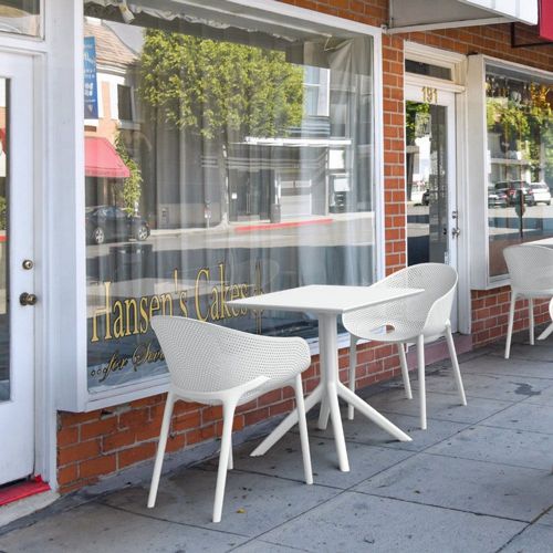 Introducing the Sky Pro arm chairs and Sky 27" square table 3 piece dining set in White - the perfect addition to any small outdoor living area! Crafted from high-quality polypropylene resin, this set is durable and weather-resistant, ensuring it will last you for years to come. Sky Pro arm chairs feature a sleek and modern design, with a comfortable seat and backrest. Sky 27" square table providing ample space for two people to enjoy a meal or drink together.