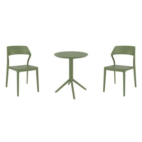 Transform your small outdoor area into a stylish space with Snow chairs and Sky 24" round folding table 3 piece bistro set in olive green. Made from durable polypropylene resin, this bistro set is perfect for balconies, terraces, decks, patios, cafes and restaurants. Snow chairs feature a sleek and contemporary design that adds a touch of sophistication to any space. Sky 24" round folding table provides plenty of room for two people to sit and enjoy a meal or drink together.