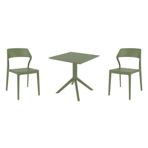 Introducing the Snow chairs and Sky 27" square table 3 piece dining set in Olive Green - the perfect addition to any small outdoor living area! Crafted from high-quality polypropylene resin, this set is durable and weather-resistant, ensuring it will last you for years to come. Snow chairs feature a sleek and modern design, with a comfortable seat and backrest. Sky 27" square table providing ample space for two people to enjoy a meal or drink together.