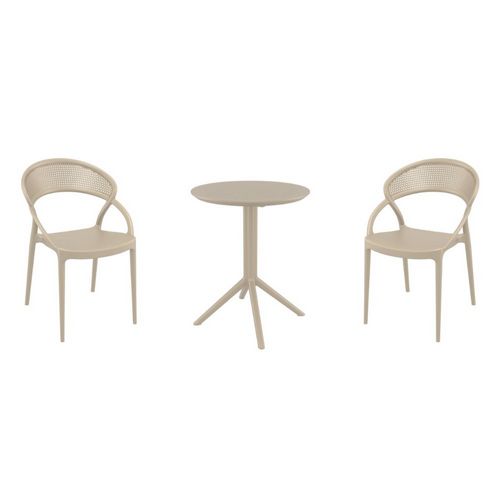 Transform your small outdoor area into a stylish space with Sunset chairs and Sky 24" round folding table 3 piece bistro set in taupe. Made from durable polypropylene resin, this bistro set is perfect for balconies, terraces, decks, patios, cafes and restaurants. Sunset chairs feature a sleek and contemporary design that adds a touch of sophistication to any space. Sky 24" round folding table provides plenty of room for two people to sit and enjoy a meal or drink together.