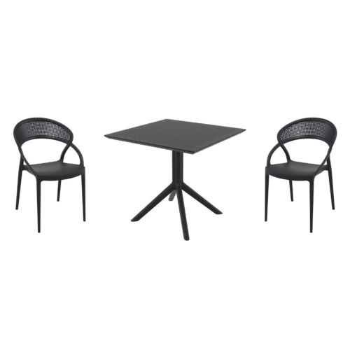 Introducing the Sunset chairs and Sky 31" square table 3 piece dining set in Black - the perfect addition to any small outdoor living area! Crafted from high-quality polypropylene resin, this set is durable and weather-resistant, ensuring it will last you for years to come. Sunset chairs feature a sleek and modern design, with a comfortable seat and backrest. Sky 31" square table providing ample space for two people to enjoy a meal or drink together.
