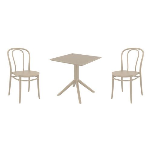 Introducing the Victor chairs and Sky 27" square table 3 piece dining set in Taupe - the perfect addition to any small outdoor living area! Crafted from high-quality polypropylene resin, this set is durable and weather-resistant, ensuring it will last you for years to come. Victor chairs feature a sleek and modern design, with a comfortable seat and backrest. Sky 27" square table providing ample space for two people to enjoy a meal or drink together.