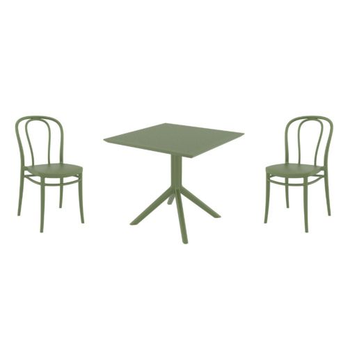Introducing the Victor chairs and Sky 31" square table 3 piece dining set in Olive Green - the perfect addition to any small outdoor living area! Crafted from high-quality polypropylene resin, this set is durable and weather-resistant, ensuring it will last you for years to come. Victor chairs feature a sleek and modern design, with a comfortable seat and backrest. Sky 31" square table providing ample space for two people to enjoy a meal or drink together.
