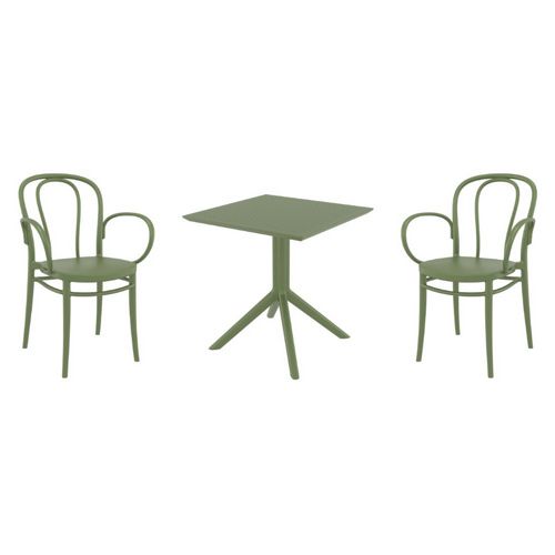 Introducing the Victor XL arm chairs and Sky 27" square table 3 piece dining set in Olive Green - the perfect addition to any small outdoor living area! Crafted from high-quality polypropylene resin, this set is durable and weather-resistant, ensuring it will last you for years to come. Victor XL arm chairs feature a sleek and modern design, with a comfortable seat and backrest. Sky 27" square table providing ample space for two people to enjoy a meal or drink together.