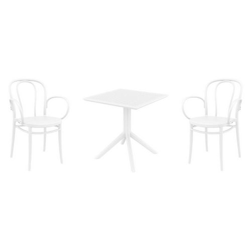 Introducing the Victor XL arm chairs and Sky 27" square table 3 piece dining set in White - the perfect addition to any small outdoor living area! Crafted from high-quality polypropylene resin, this set is durable and weather-resistant, ensuring it will last you for years to come. Victor XL arm chairs feature a sleek and modern design, with a comfortable seat and backrest. Sky 27" square table providing ample space for two people to enjoy a meal or drink together.